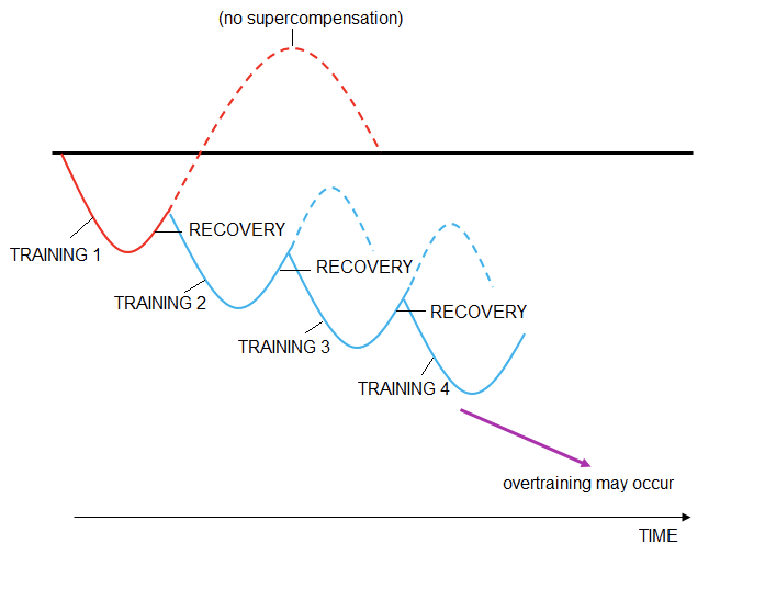 As you can see in the picture below you start off on the baseline, exercise breaks you down a little bit then you recover, (Supercompensate), and go just above the original baseline to give you a new level. Exercise again at the optimum time, you break down a little again, recover and super compensate again raising the baseline yet again. Keep doing this and you will start to feel fitter and stronger.